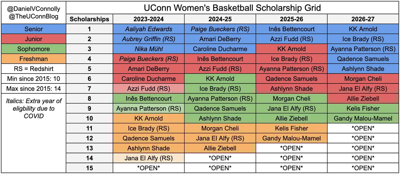 UConn has enough scholarships for Bueckers to come back. If she decides to stay, she’d be the 13th player on the roster, including the 10 projected returners and two incoming freshmen but excluding the three other seniors (Aaliyah Edwards, Aubrey Griffin, and Nika Mühl, who all have an additional year of eligibility).