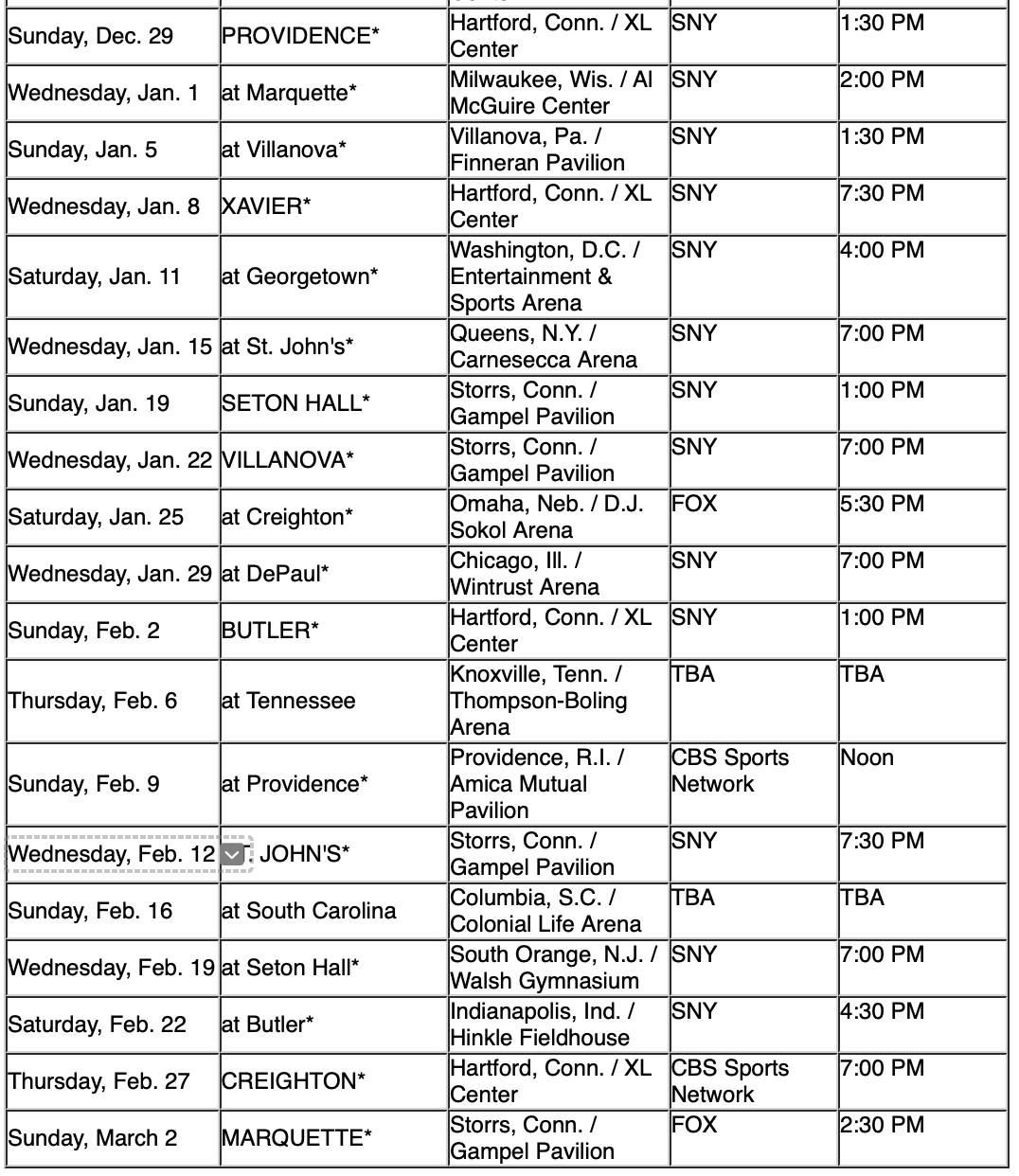 UConn’s trips to Tennessee (Thursday, Feb. 9) and South Carolina (Sunday, Feb. 16) still do not have start times or television information.